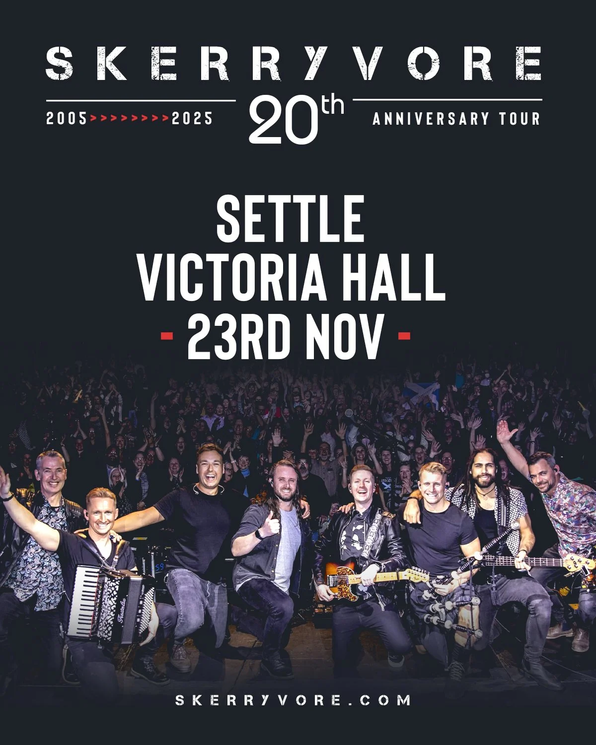 Three time winners of Scotland’s ‘Live Act of the Year’ award, Skerryvore have evolved from their humble beginnings to become one of the country’s leading forces in a thriving live music scene. At the forefront of a movement that has reinvented and reignited a traditional Scottish scene for a modern, multicultural audience, the band have brought their high energy performances to audiences across the globe. From their early days in Scottish West Coast halls and bars, to festival crowds in the USA, Canada, Australia and throughout the UK and Europe, Skerryvore’s wide range of influences and talent produce a musically expansive, immersive yet intimate set that excites and captivates audiences.